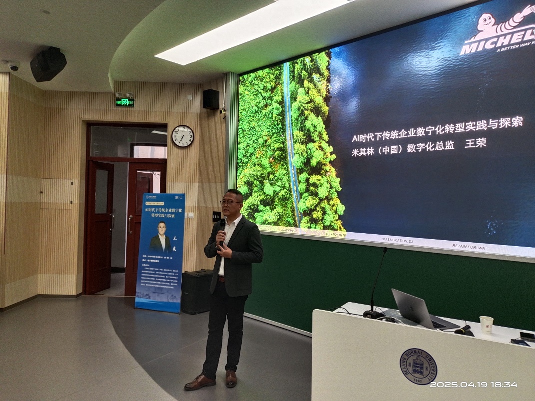 2025年4月19日晚,百家乐老虎机 “数字经济与管理大讲堂”第42讲《AI时代下传统企业数字化转型探索与实践》在电子楼阶梯教室举办。本次讲座特邀米其林中国数字化转型总监王荣主讲。MBA教育中心主任周江华主持讲座,150余位学院本、硕、博学生到场聆听。