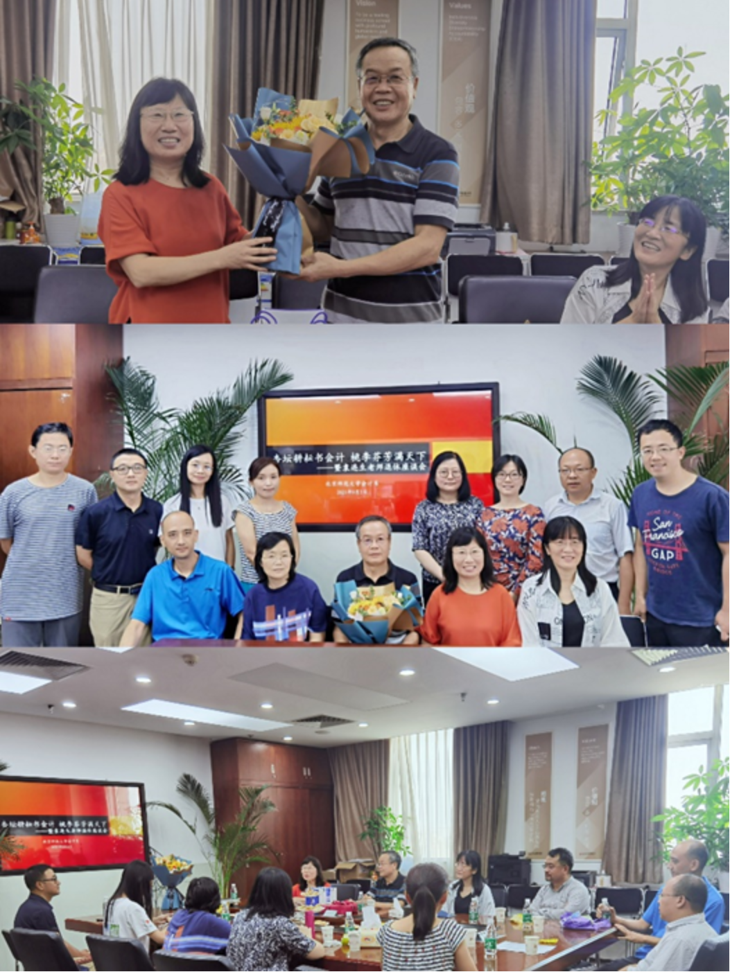 座谈会现场温馨,电脑屏幕上循环播放着会计系过去二十年曾经举办过的各种活动照片,还有老师们共事的愉悦历史瞬间,《相亲相爱一家人》的背景音乐不仅契合了这一活动主题,表达着对袁老师的依依不舍,更是对会计系组织文化主旋律的坚定弘扬,一如这个组织与时俱进的守正创新、和谐发展的文化基因。