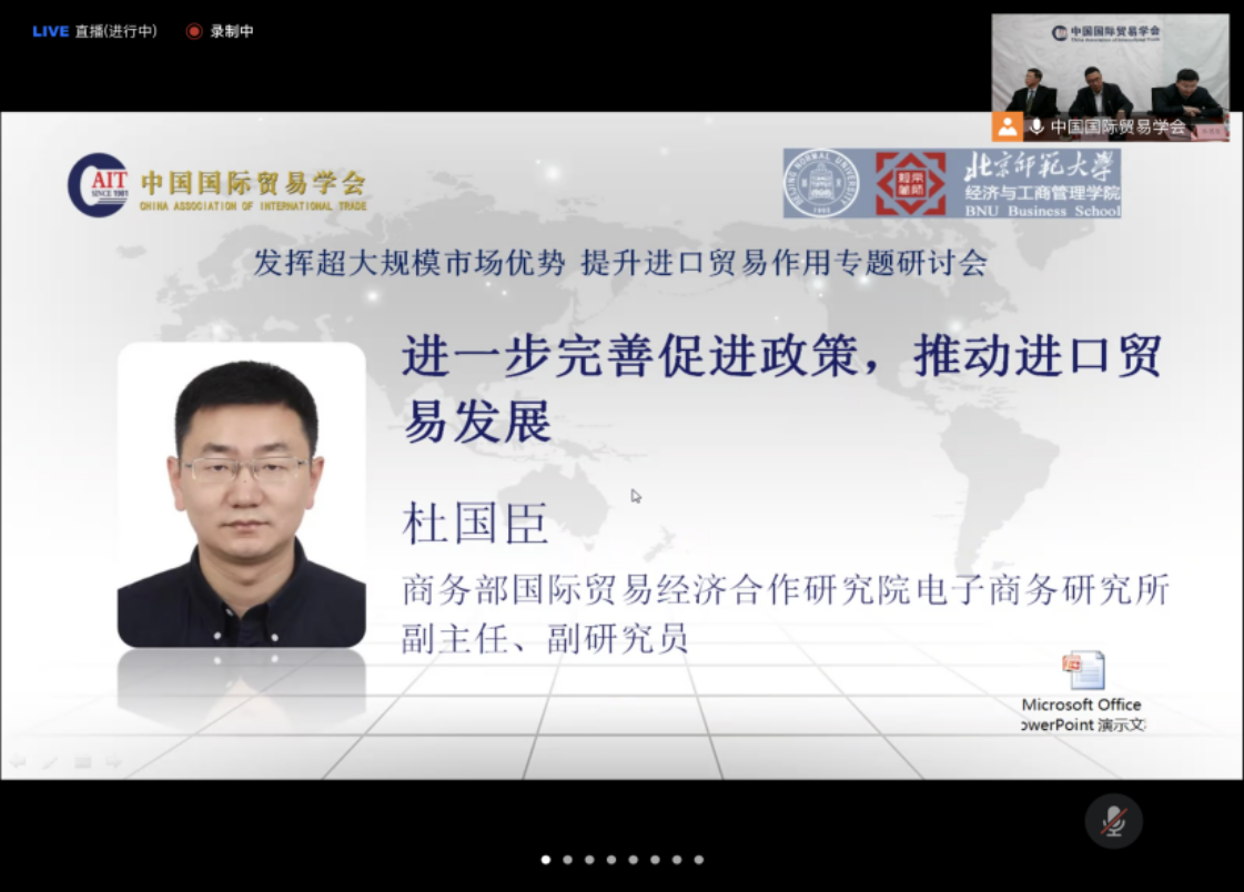 上午场活动是由中国国际贸易学会和百家乐老虎机-电子百家乐 共同举办的“发挥超大规模市场优势,提升进口贸易作用”专题讲座,直播观看人数500多人,线上参会人数约150余人。由中国国际贸易学会金旭会长和百家乐老虎机-电子百家乐 戚聿东院长分别进行致辞。由中国国际贸易学会边振瑚副会长主持会议。