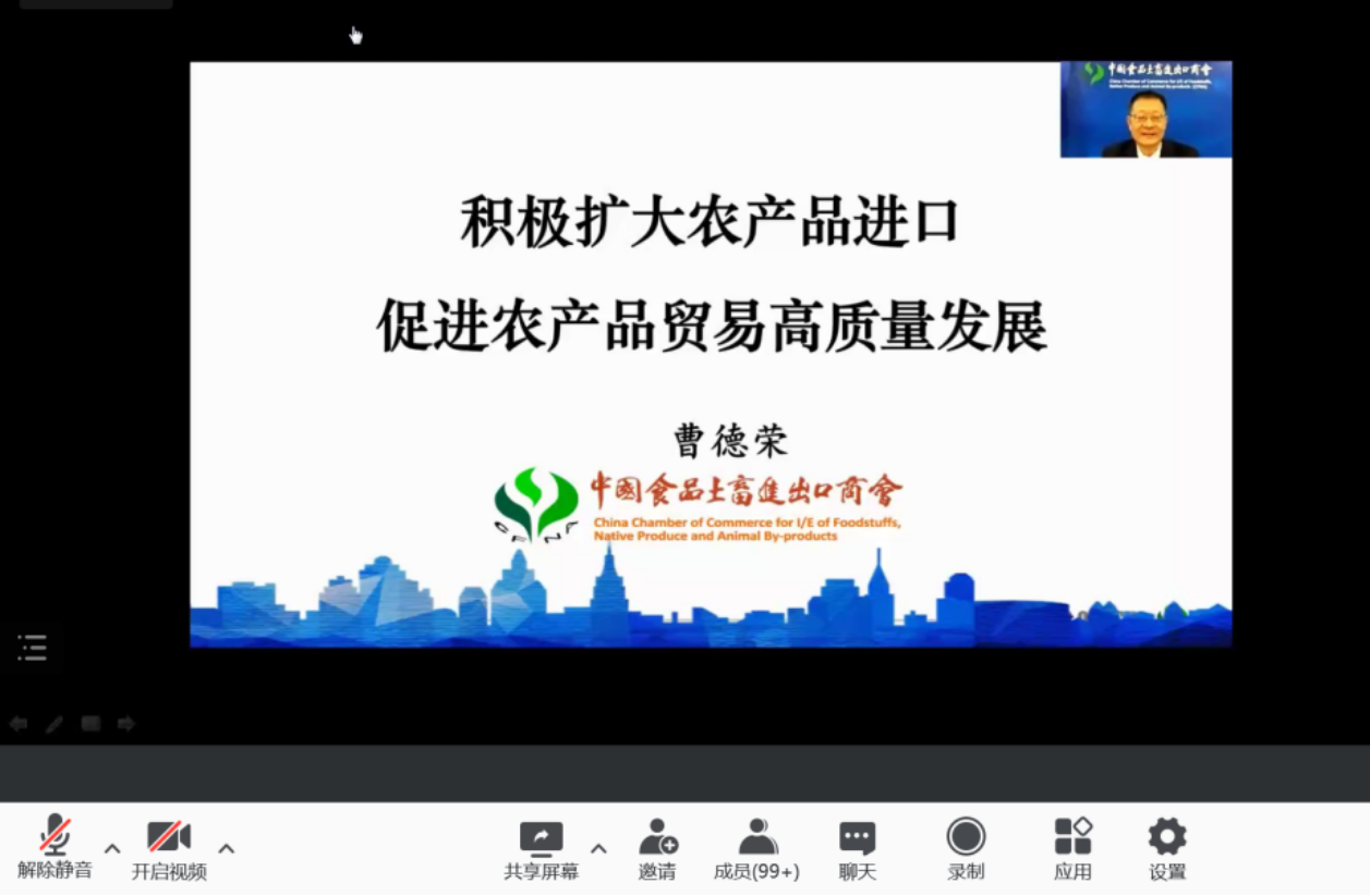 上午第三位演讲嘉宾是中国食品土畜进出口商会曹德荣会长,演讲题目为“积极扩大农产品进口,促进农产品贸易高质量发展”。曹德荣会长首先强调了农产品进口市场在我国经济发展中的重要地位,指出我国农产品进口增速明显加快、进口商品结构不断优化、进口市场集中度偏高以及进口市场主体表现活跃的发展现状;接着,曹德荣会长对当期我国农产品进口的形式进行了分析,包括国内农产品供需“紧平衡”格局未变、进口“大国效应”作用突出、开放政策有利于进口、中国积极履行中美第一阶段协议以及农产品进口高位盘整等内容。最后,曹德荣会长表示品牌提升、渠道下沉和数字化增长成为未来中国农产品进口高质量发展关键。伴随全球农产品食品产业链优质资源加速增长,中国进口政策红利的持续释放,以及国内居民食品消费升级,中国农产品进口市场的未来充满希望。
