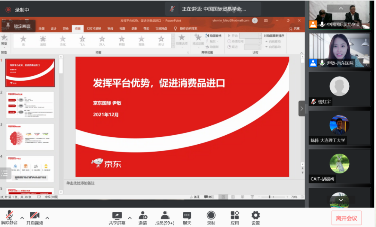 上午第四位演讲嘉宾是京东集团国际事业部国家馆项目负责人尹敏,其分享的主题为“发挥平台优势,促进消费品进口”。尹敏女士首先回顾了中国跨境电商的发展历程和规模,估计2021年中国海淘用户现存规模达到2.35亿,表明我国进口市场潜力巨大;接着,尹敏女士介绍了京东国际的定位、战略以及重大项目,表示京东国际将更好地发挥线上平台的优势,将进博会在线上做更好的拓展,扩大线下会展的效应;最后,她表示会继续积极响应国家政策,努力成为“进口”国家队的成员,为国家做更多的扩大进口、更好地满足消费者的需求而努力。