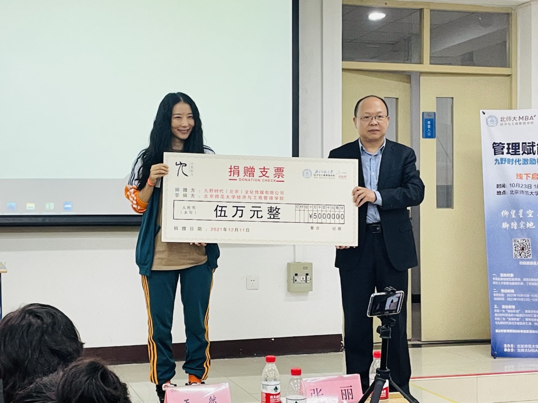 九野时代公司对本次活动非常满意,并且为学院带来一份特殊的礼物:向学院MBA中心捐赠现金5万元成立基金,用于支持学院相关的学生活动及中心未来发展。公司创始人之一王然表示,这不仅是对参与九野时代激励机制同学做出智慧贡献的感谢,更是作为北师学子对中心发展的感谢与支持。活动以来同学们为九野时代作出的努力令人十分感动,项目方案兼具专业性与落地性,大大超出了最初的期待,带来很多惊喜,作为北师学子,她深感自豪。