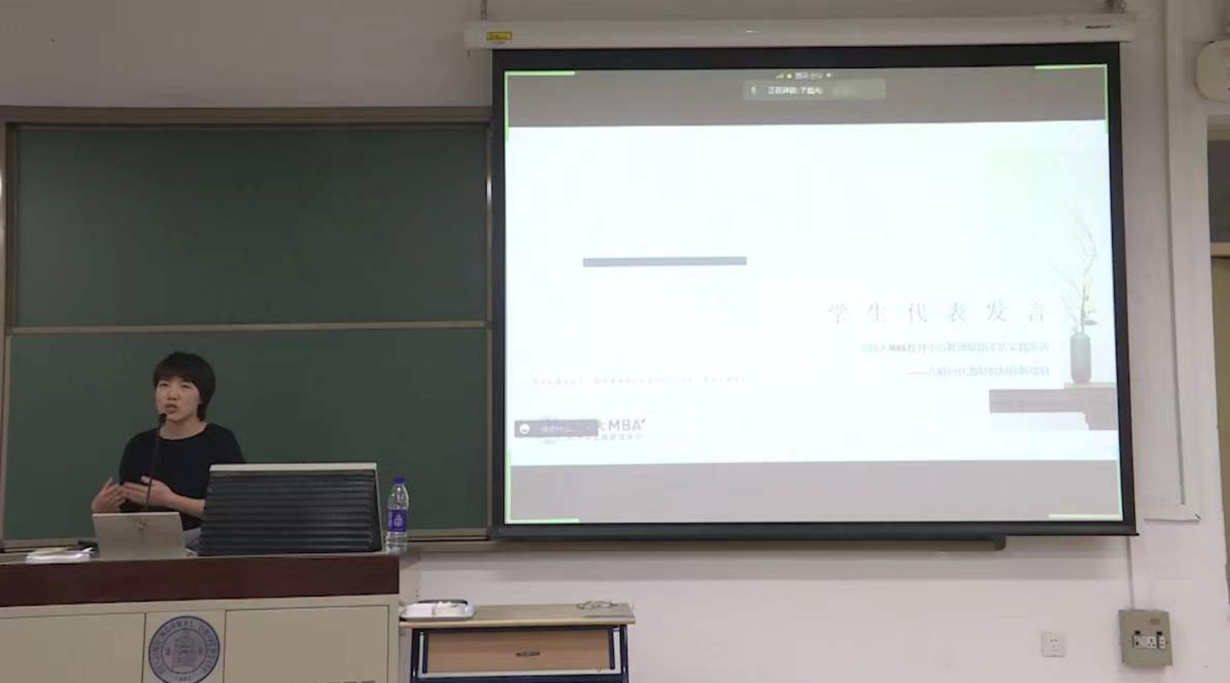 分组汇报结束后,2021级刘茜作为学生代表发言,作为项目的参与者,她为我们讲述了如何在繁重的课业任务和忙碌的考试周中争分夺秒,同时看到大家如此高标准完成项目方案,她深感敬佩。她表示:这次实践活动中,通过老师的帮助、管理咨询专家的指导,有机会深入探讨创业公司管理过程中遇到的问题,了解如何运用学科所学解决问题,从一个对咨询“零基础”的学生到完成一套项目方案的交付,收获良多。