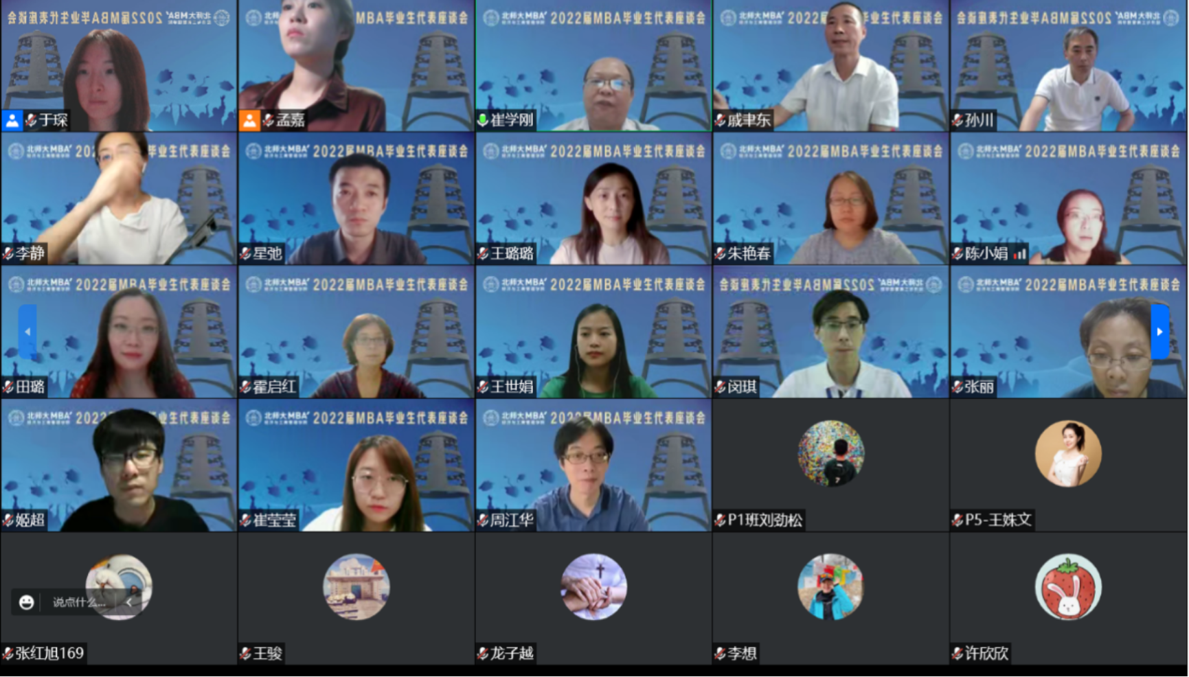 6月28日晚19点,百家乐老虎机 2022届MBA毕业生代表座谈会通过腾讯会议平台在云端召开。学院院长戚聿东、分党委副书记葛玉良、副院长崔学刚、MBA教育中心主任孙川,副主任周江华、李静、王璐璐,2022届毕业班班主任和MBA教育中心全体老师与来自2022届毕业班、学生联合会的14名毕业生代表座谈交流。本次会议由副院长崔学刚主持。