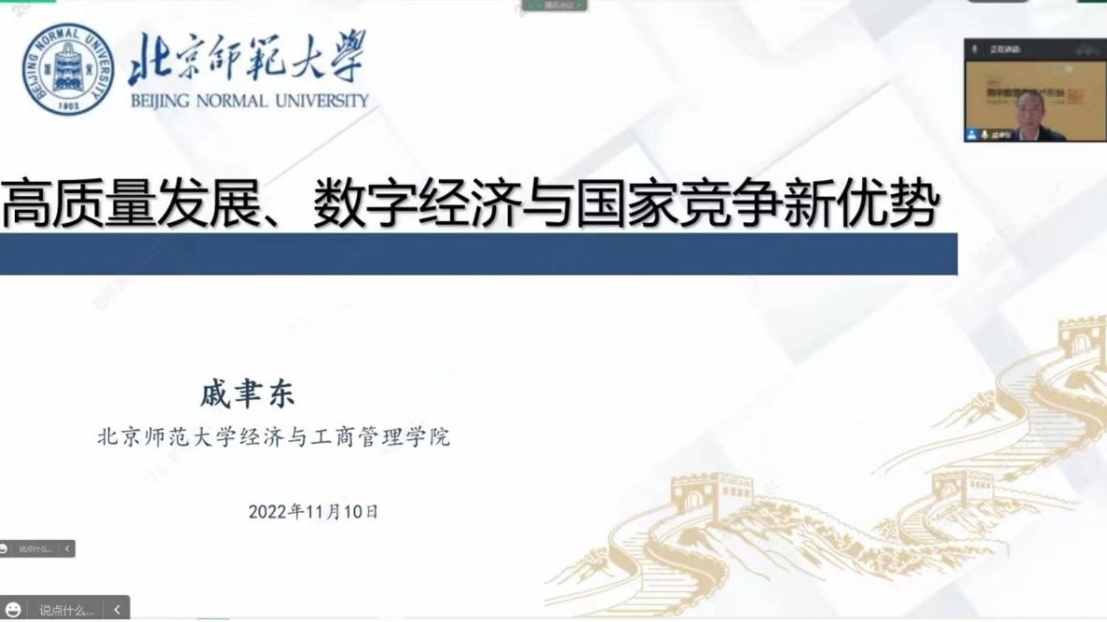 11月10日,百家乐老虎机 院长戚聿东教授带来 “高质量发展、数字经济与国家竞争新优势”主题讲座。他从引领现代化产业体系建设、赋能全面推进乡村振兴、促进区域协调发展、构建高水平社会主义市场经济体制和推进高水平对外开放等方面阐述了数字经济助力我国实现高质量发展的途径。他指出,发展数字经济是一项长期系统工程,要抓好重点领域和关键环节,在“扬长”的同时,坚持把“补短”作为重中之重。要突出加强数字技术的原始创新,加快实现技术标准国际化,超前布局数字基础设施,把工业互联网智能制造作为数字经济发展的“主战场”,加快弥补数字人才供给缺口。
