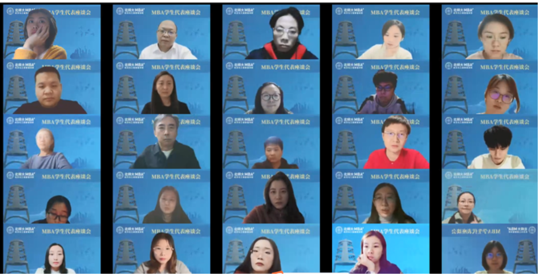 2022年11月26日晚17:30,百家乐老虎机 MBA学生代表座谈会通过腾讯会议平台在云端召开。此前,学院安排各班通过班会推荐代表,MBA教育中心又安排参会代表广泛了解同学学习、工作和生活状况,掌握学生的心理和精神状态,征集同学诉求和意见。