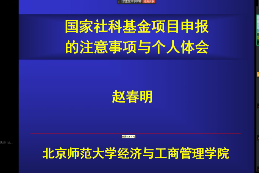 为切实做好 2025 年度国家社科基金项目申报工作,进一步强化有组织科研,4 月 16 日,学院成功召开 2025 年度国家社科基金项目申报指导与交流会。此次会议邀请赵春明教授进行指导,近 50 名有申报意向的教师、博士研究生以及博士后通过线上方式踊跃参会。会议由魏浩副院长主持。