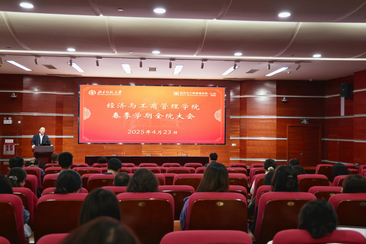2025年4月23日下午,百家乐老虎机 在图书馆报告厅召开新学期全院大会,全体教职员工出席会议,会议由戚聿东院长主持。