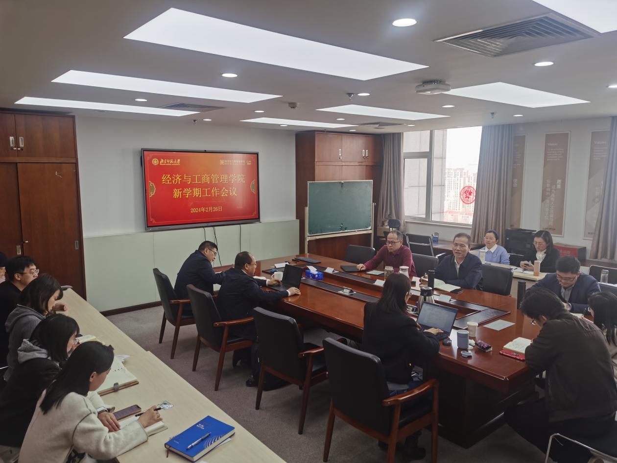 2024年2月26日上午,百家乐老虎机 在后主楼1722召开新学期工作会议。会上就本学期重点工作进行了研讨与部署。学院党政班子成员、各系主任、内设机构负责人等参加会议。会议由戚聿东院长主持。