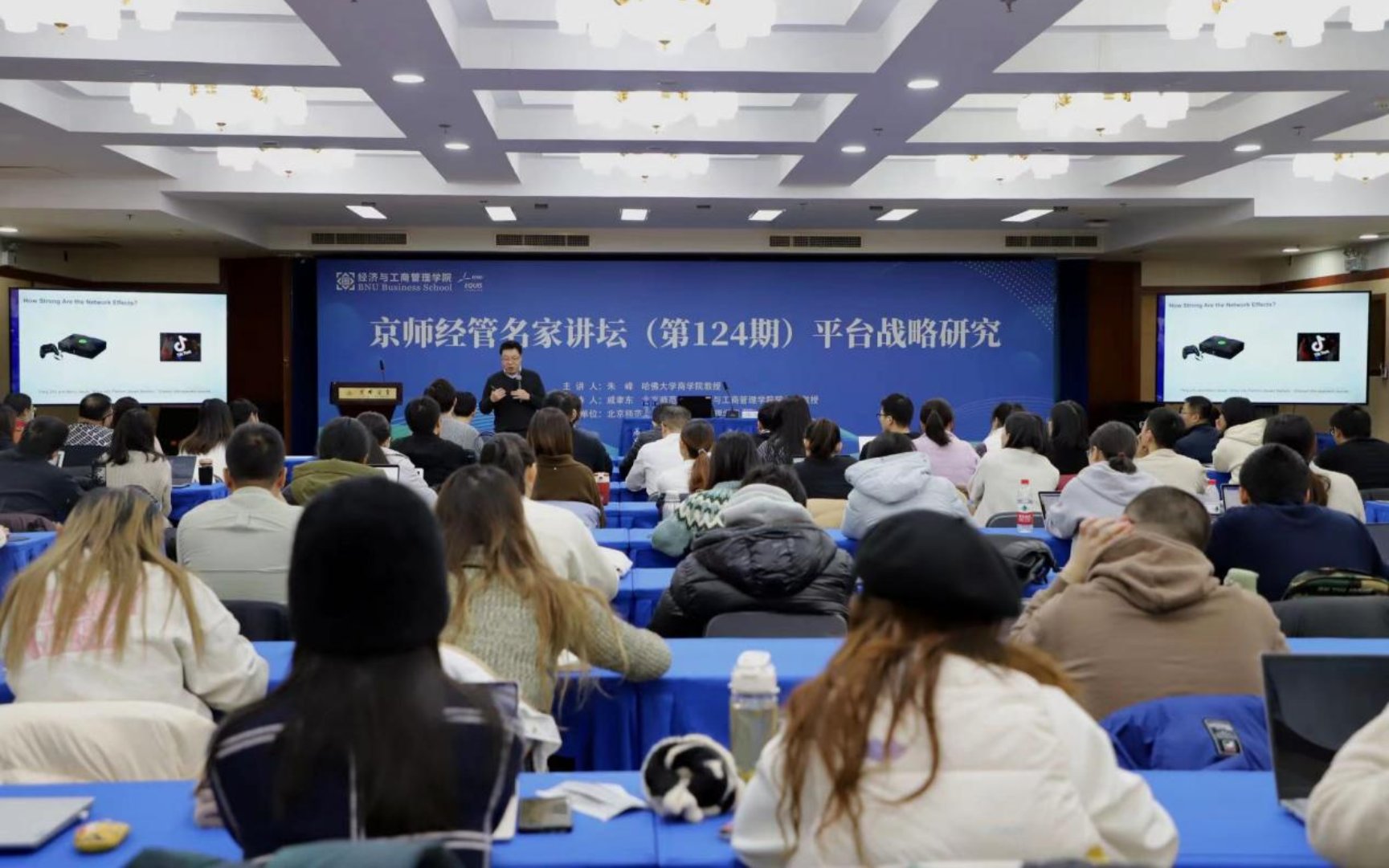 2023年12月21日下午,百家乐老虎机-电子百家乐 “京师经管·名家讲坛”(第124期)在京师大厦第六会议室举行。本次讲座由哈佛大学商学院朱峰教授主讲。学院院长戚聿东、数字经济与管理系主任焦豪、MBA教育中心主任周江华、经济系教授何浩然以及校内外师生约一百余人参加讲座,讲座由戚聿东院长主持。