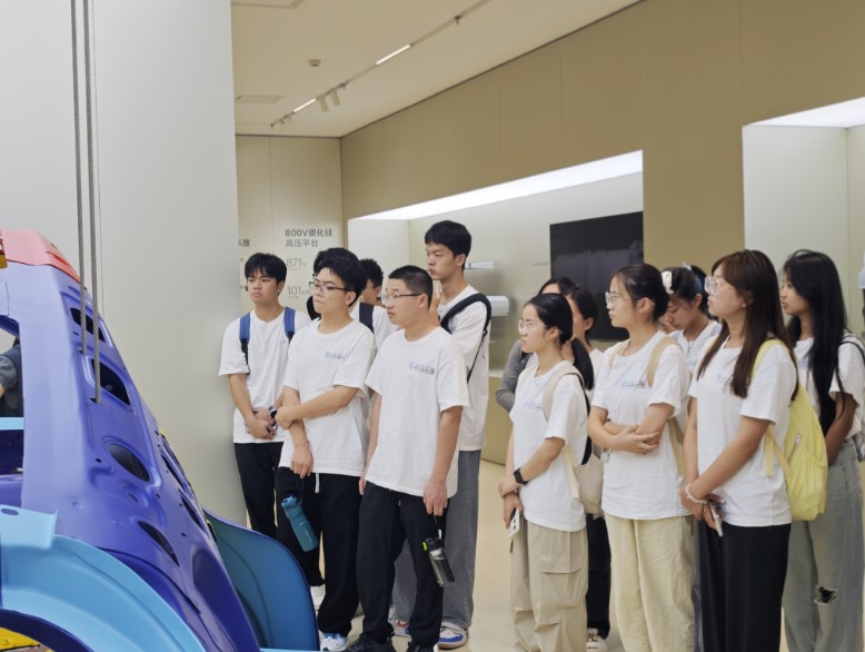 工作人员首先带领师生参观体验了小米汽车展厅,细致介绍了小米的发展历程。从每一个精细部件,诸如电池安全的配置、超级电机的构成、车身使用材料及车型设计、自研芯片的开发等,到汽车整体的宏观格局,随着宣讲员的娓娓道来,大家更加深入地了解了“小米汽车”的设计巧思。随后,师生一行搭乘小米工厂摆渡车参观了小米汽车生产车间,实地观察智能化工厂如何利用智能设备(如搬运机器人与机械臂)大幅度提高生产效率,并通过严格的数控质量管理体系达成产品零瑕疵目标,从而对智能制造生产场景有了更加直观的认识。